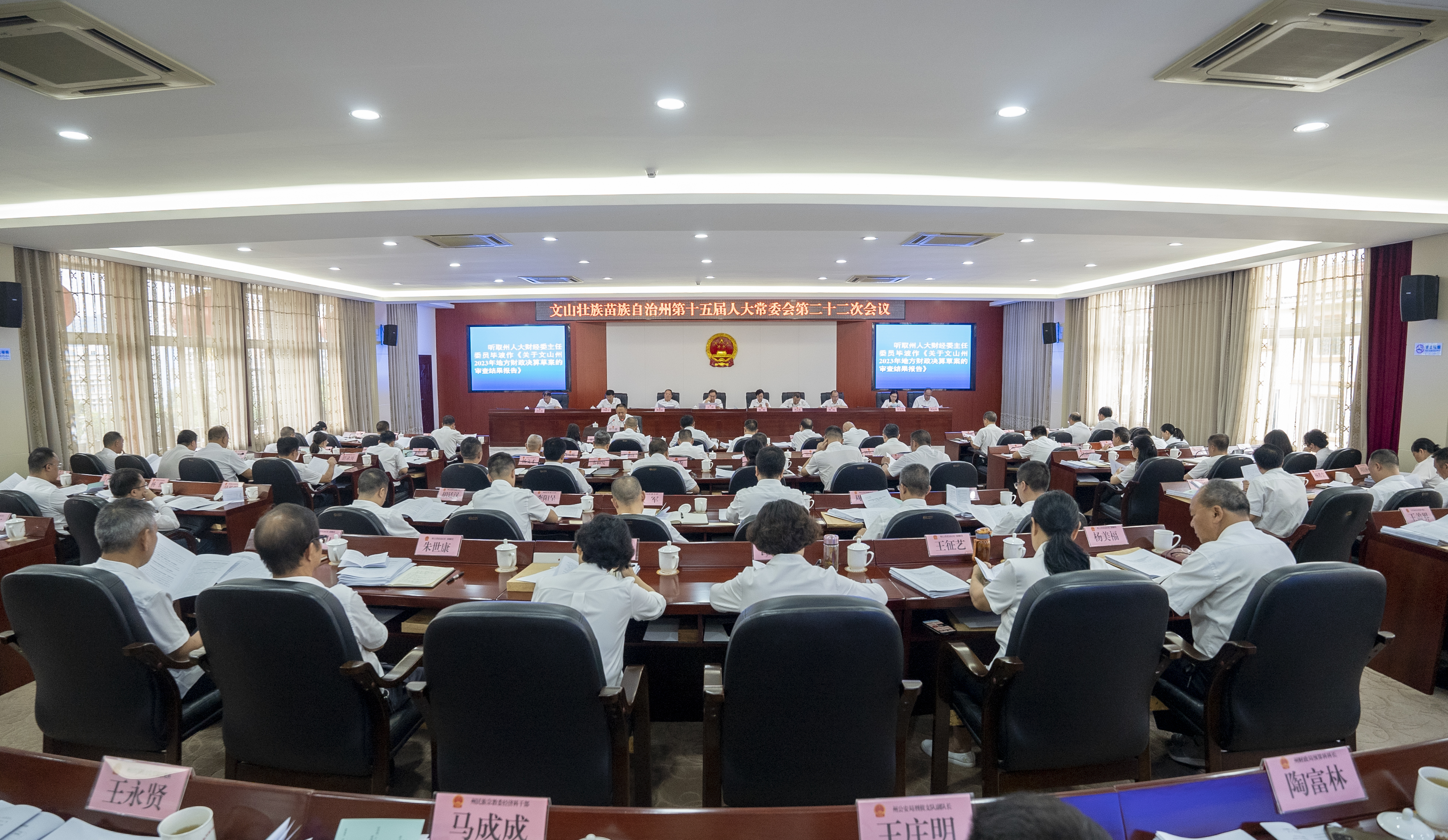 会议应到常委会组成人员46人,实到38人,符合法定人数。会议通过了州十五届人大常委会第二十二次会议议程(草案)。会议传达学习党的二十届三中全会精神;听取了《州人民政府关于文山州2024年1至6月国民经济和社会发展计划执行情况的报告》;听取了《州人民政府关于文山州2023年地方财政决算草案的报告》《州人大财经委关于文山州2023年地方财政决算草案的审查结果报告》;听取了《州人民政府关于2023年本级财政预算执行和其他财政收支的审计工作报告》;听取了《州人民政府关于文山州2024年1至6月地方财政预算执行情况的报告》;听取了《州人民政府关于全州三七产业发展情况的报告》《州人大常委会调研组关于全州三七产业发展情况的调研报告》;听取了《州人大常委会视察组关于文山州现代化边境幸福村建设巩固提升情况的视察报告》《州人大常委会调研组关于全州公安机关打击防范盗窃犯罪工作情况的专题调研报告》《州人大常委会调研组关于对全州贯彻落实国务院<医疗保障基金使用监督管理条例>工作情况的专题调研报告》;听取了州人大常委会主任会议关于提请审议《文山壮族苗族自治州人民代表大会及其常务委员会立法条例(修正草案)》的议案;听取了《州人民政府关于2024年度重大民生实事人大代表票决项目实施进展情况的报告》;审查了《州人大常委会调研组关于2024年度重大民生实事人大代表票决项目实施进展情况监督调研报告(书面)》;听取了《文山壮族苗族自治州第十五届人民代表大会常务委员会代表资格审查委员会关于个别代表的代表资格审查情况的报告》等。会议期间,州人大常委会组成人员分组审议了有关报告、决议、条例(草案)和人事事项;召开联组会议对全州三七产业发展情况开展专题询问;召开州十五届人大常委会第65次主任会议,听取各组组长汇报分组审议有关报告、条例(草案)和人事事项的情况。会议表决通过了《关于批准文山州2023年州本级财政决算的决议(草案)》《文山壮族苗族自治州第十五届人民代表大会常务委员会代表资格审查委员会关于个别代表的代表资格审查情况的报告》及有关人事任免事项。会议向新任职人员颁发任命书并举行宪法宣誓仪式。