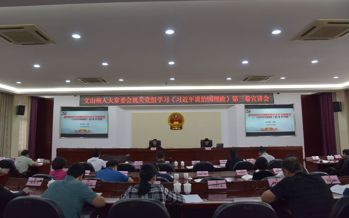 9月19日,州人大常委会机关邀请文山学院马克思主义学院副教授张俊对深入学习宣传贯彻《习近平谈治国理政》(第三卷)作专题讲授。