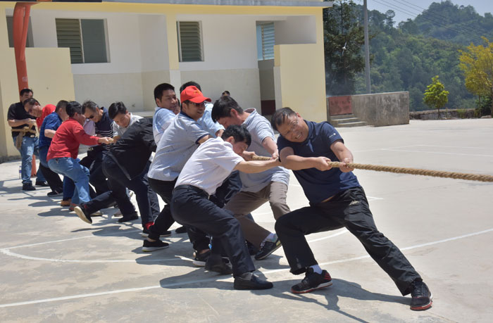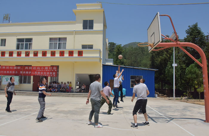 烈日下,机关干部职工与村干部开展了拔河、篮球联谊活动。