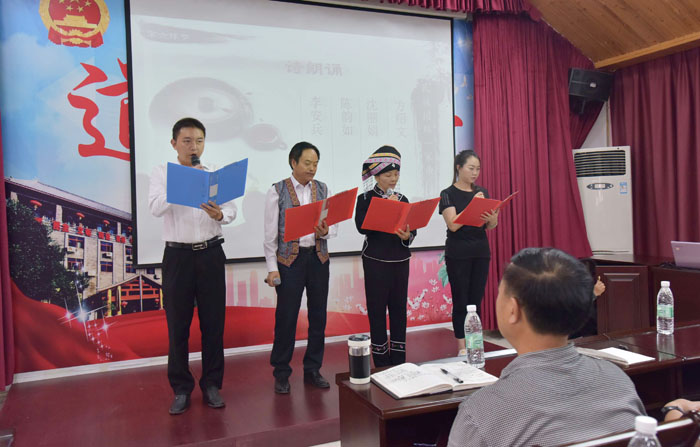 按照道德讲堂七个环节的要求,大家首先进行的是省自身,然后齐唱爱国歌曲《爱我中华》。在学模范环节,大家认真观看了《云南民族团结进步示范家庭-杨秀弟》。在诵经典环节,大家认真学习了《弟子规》中的经典名句“凡是人,皆须爱;天同覆,地同载”和梁启超的经典名句“国家兴亡,匹夫有责”。在赛知识环节,现场的干部职工争相抢答,气氛十分活跃。在诗朗诵环节,4位同志为大家朗诵了“民族团结一家亲”。在送吉祥环节,工作人员为大家送上《文山州人大常委会创建民族团结进步示范机关-知识读本》。