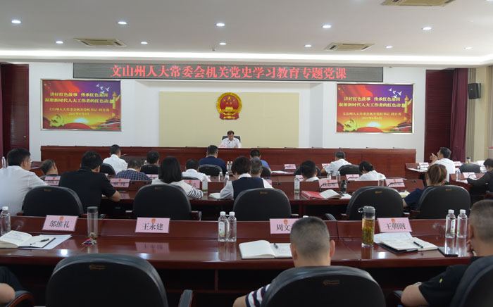 讲授内容分三块,一是聆听红色故事,认真学习革命先辈的光荣传统;二是聆听红色故事,深刻感悟文山奋斗史的磅礴伟力;三是聆听红色故事,凝聚新时代人大工作者的红色动力。
