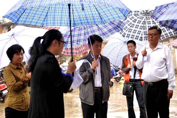 调研组冒雨在文山市阳光农贸市场调研  调研组在爱伲牛肉餐饮店查看台帐  调研组在东山农产品质量安全监管站调研